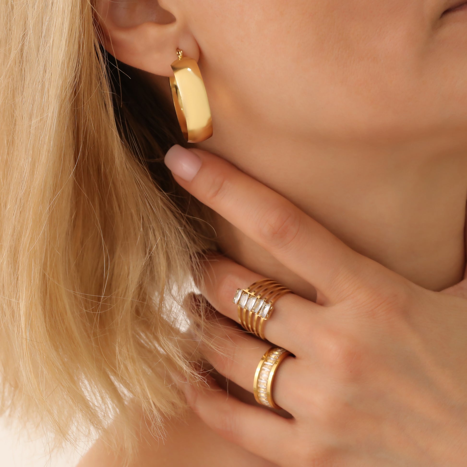 These AMANDA EARRINGS are a must-have for any jewelry collection. Their classic thick design provide a timeless and elegant look. Add a touch of sophistication to any outfit with these expertly crafted earrings.