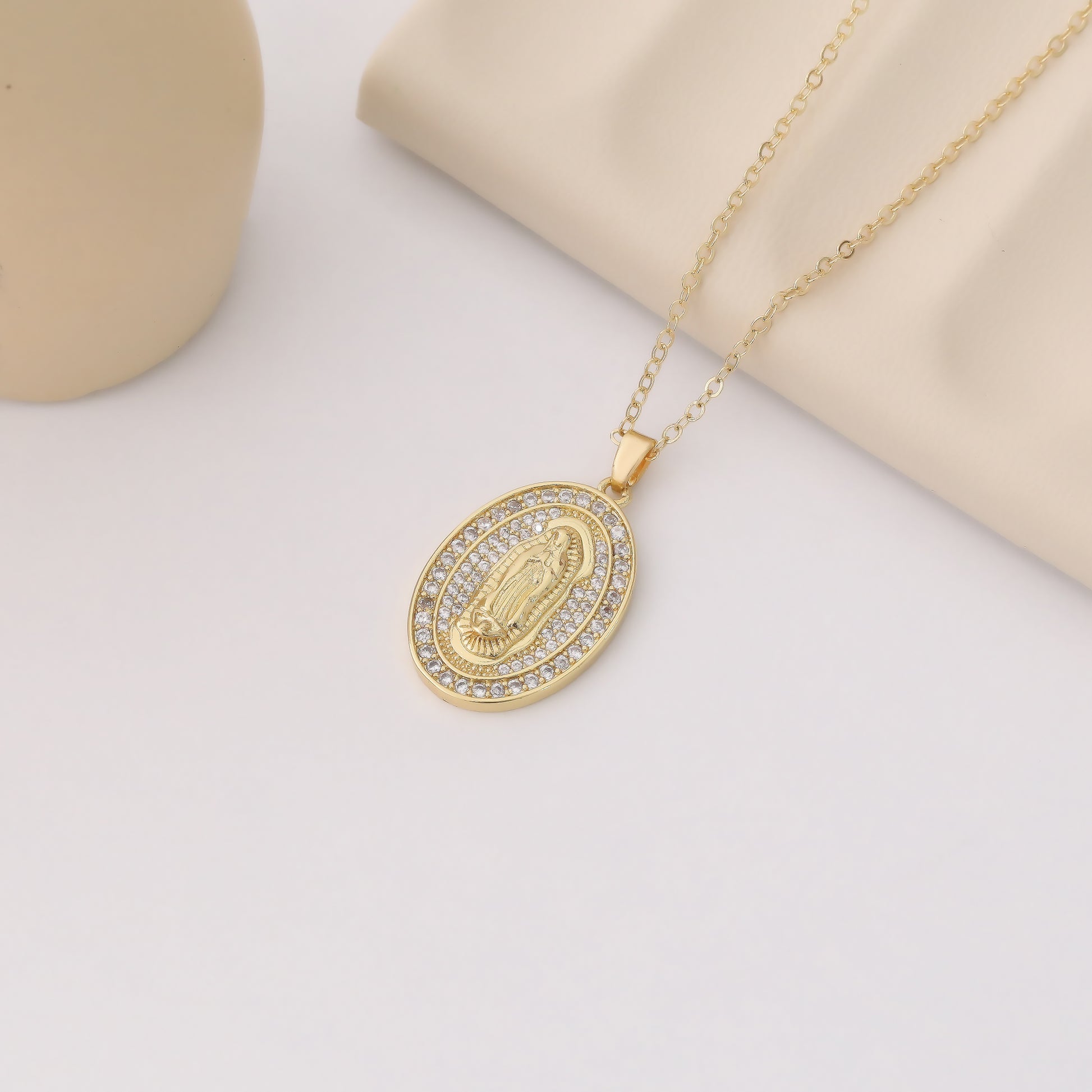 This stunning MARRY NECKLACE features a beautifully detailed virgin Mary pendant, accented with sparkling zirconia stones. Crafted with precision and care, this necklace is a meaningful and elegant addition to any jewelry collection. Adorn yourself with faith and style.