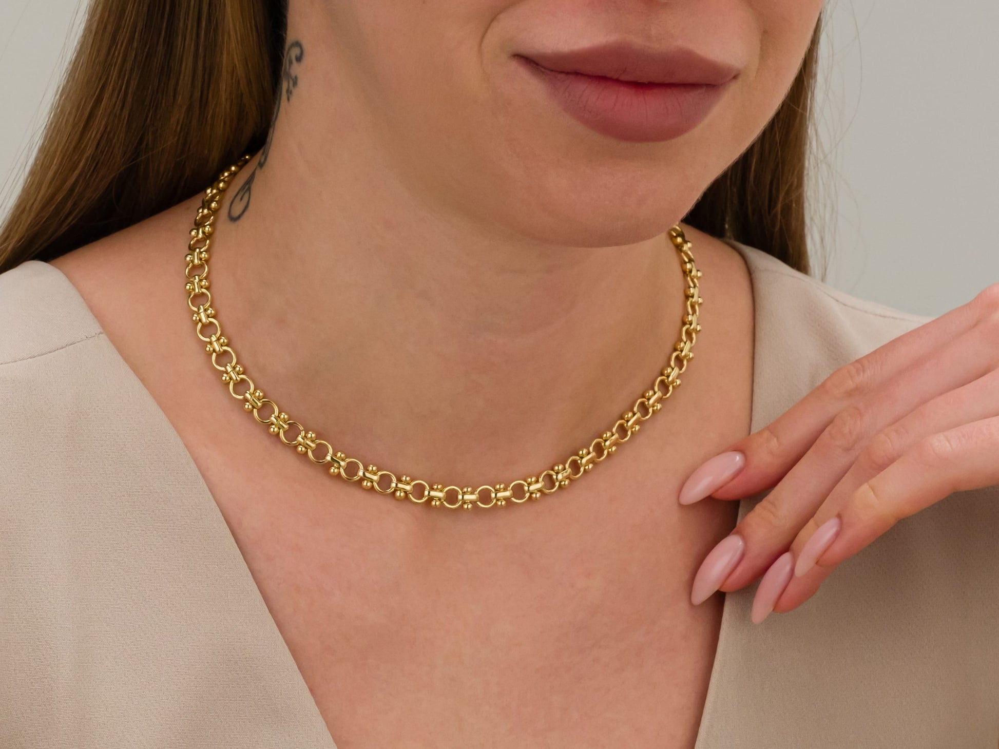 Discover the sleek and sophisticated RAYA NECKLACE. Made from a chic chain, this necklace adds a touch of elegance to any outfit. Elevate your style with this simple yet stunning accessory.