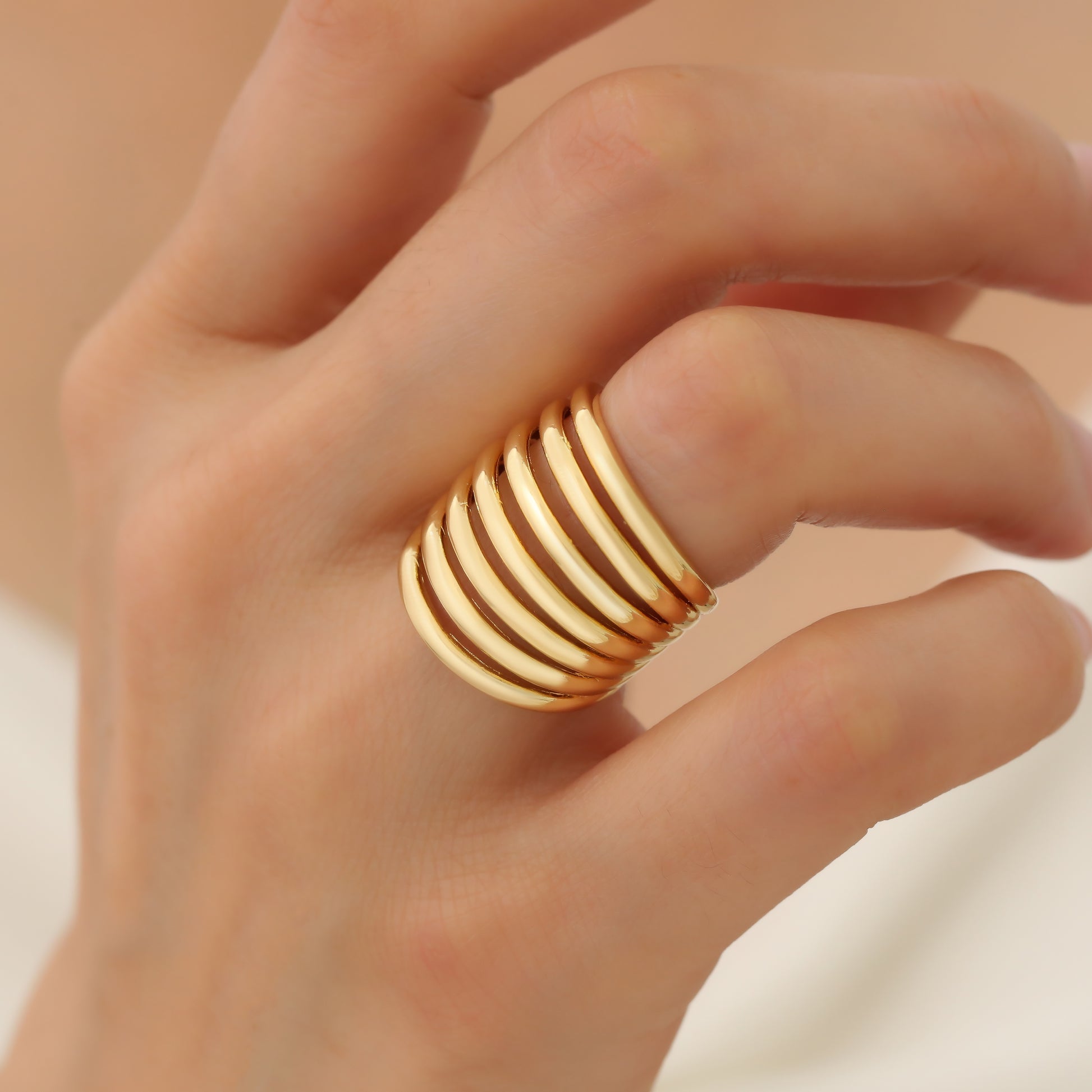 The JORDANE RING is a bold and stylish accessory that will never tarnish, maintaining its chic appearance. Expertly crafted with non-tarnish materials, this ring is sure to elevate any outfit with its timeless design. A must-have for anyone wanting to make a statement