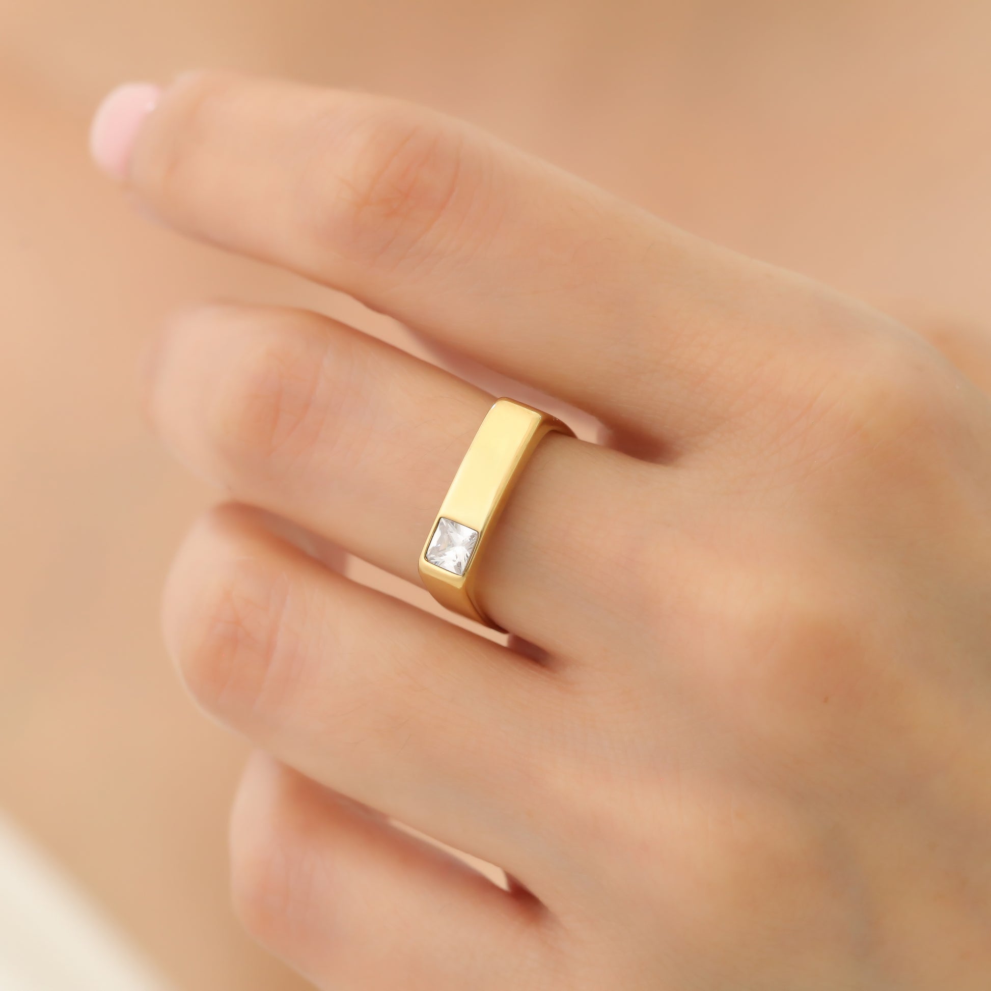 Expertly crafted with a sleek square shape, the MONROE RING radiates modern elegance. Adorned with a sparkling zirconia stone, this ring adds a touch of sophistication to any outfit. Upgrade your jewelry collection with this must-have statement piece